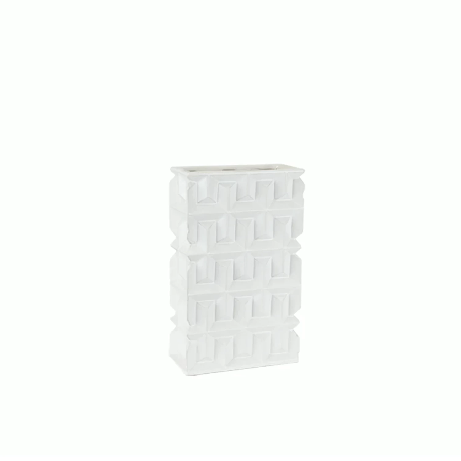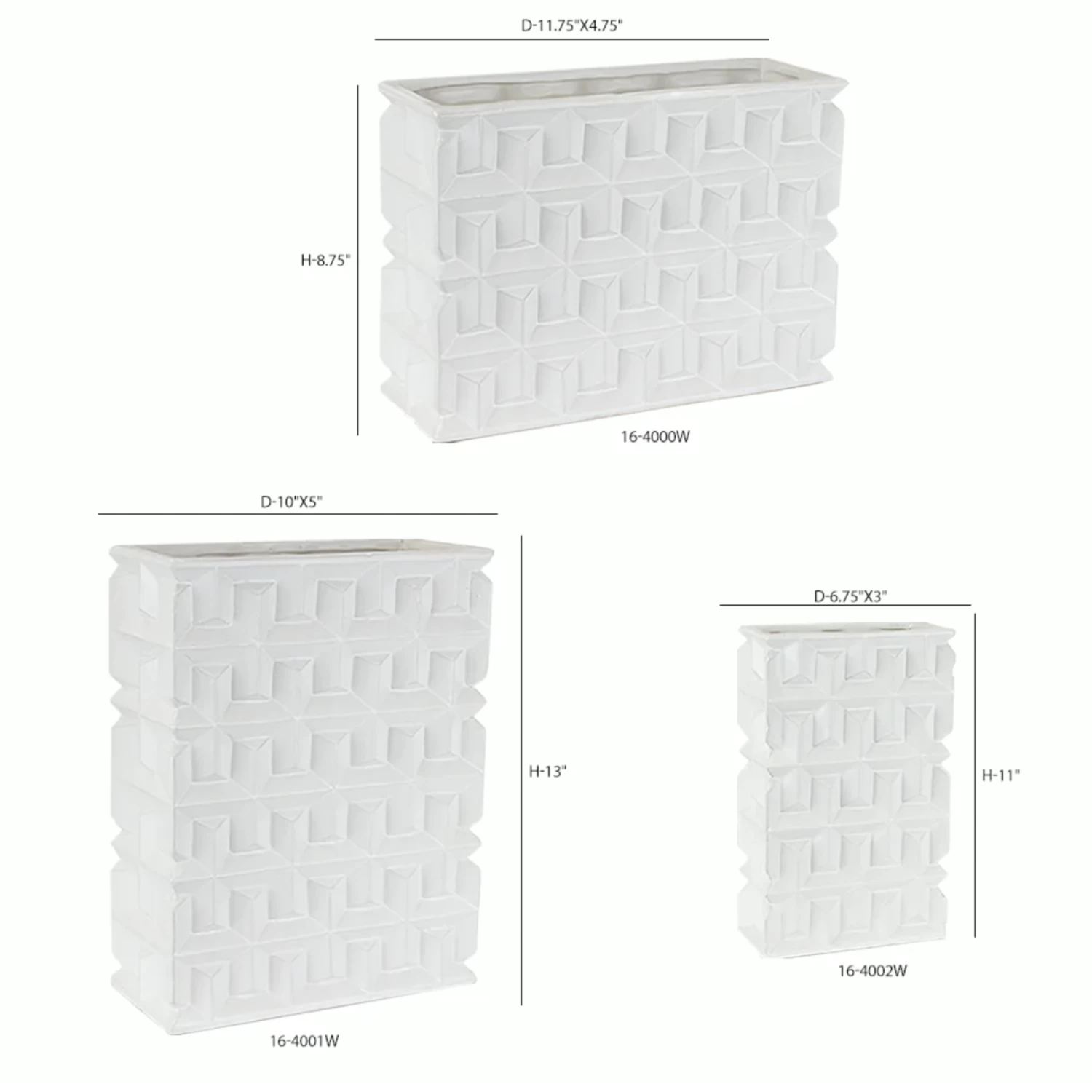 11”H X 6.75” X 3” WHITE EMBOSSED SQUARE CERAMIC VASE