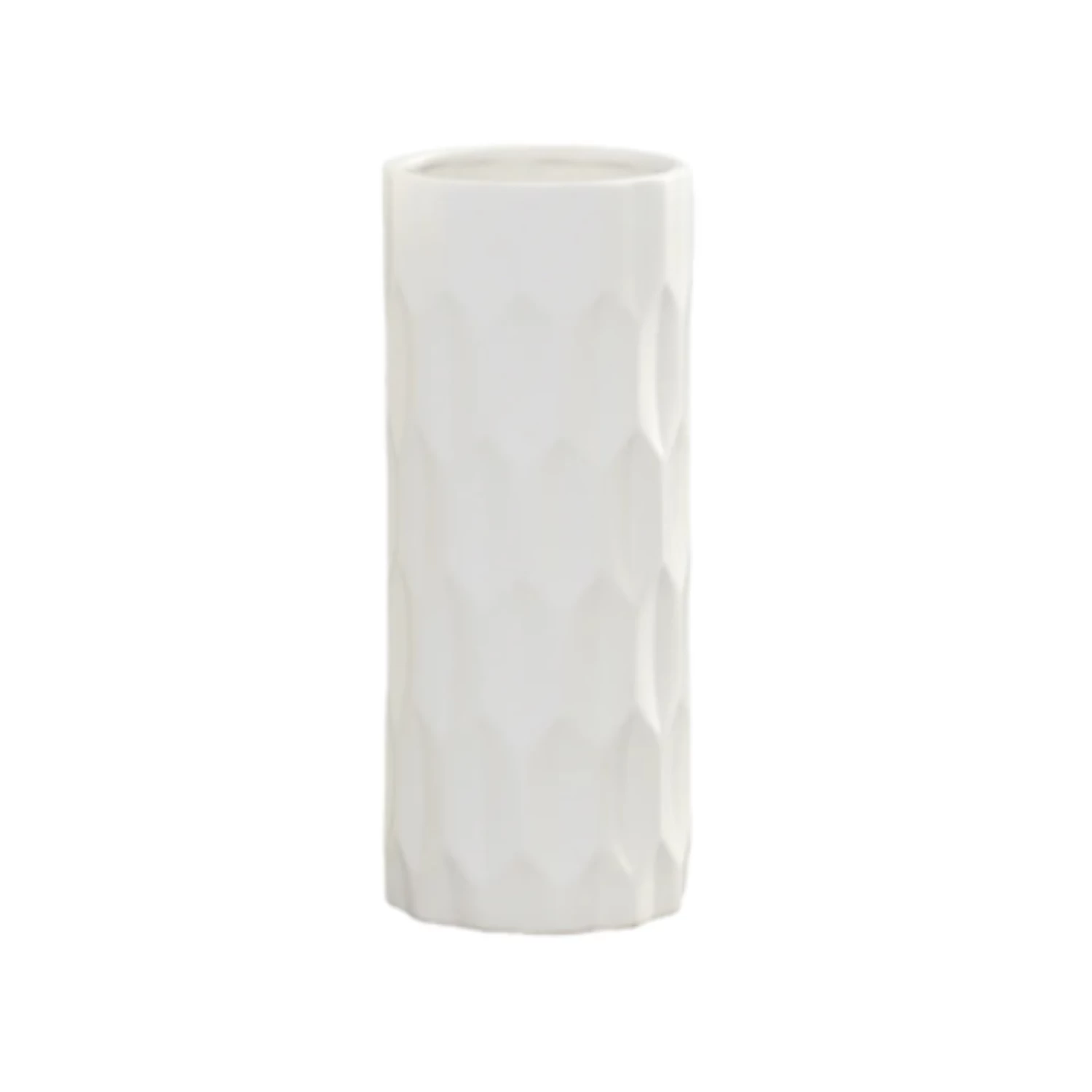 12.25”H X 5” SMALL MATTE WHITE CERAMIC VASE WITH HEXAGON PATTERN