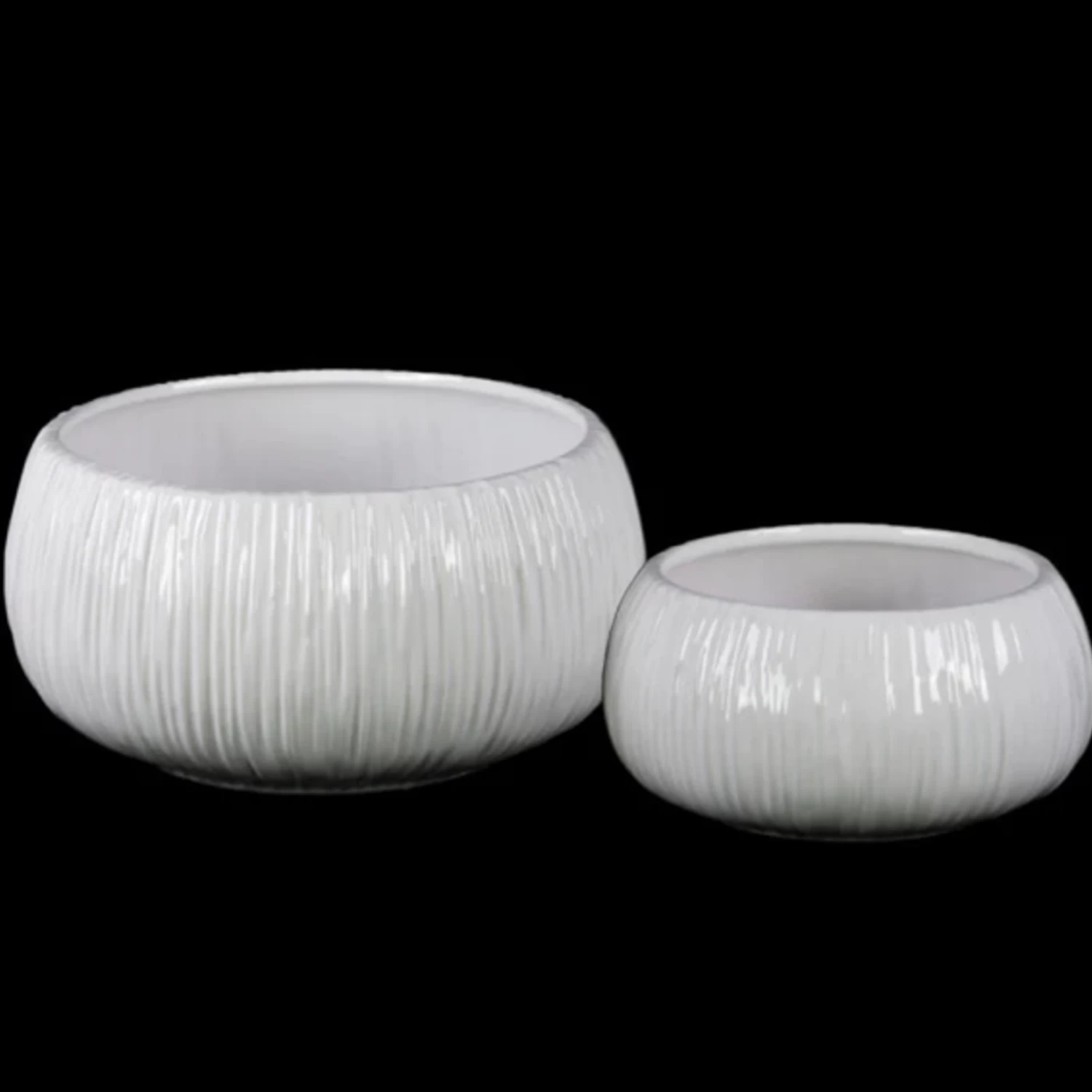 4”h X 8”d SMALL LOW ROUNDED CYLINDER WHITE CERAMIC RIBBED