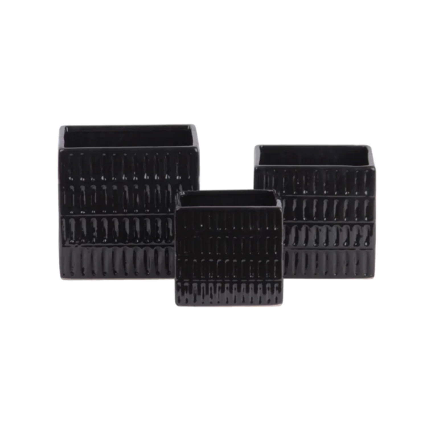5.75”H X 6” X 6” LARGE BLACK Ceramic Square Pot With 4 Tier Embossed Oblong Lattice Design Body And Tapered Bottom