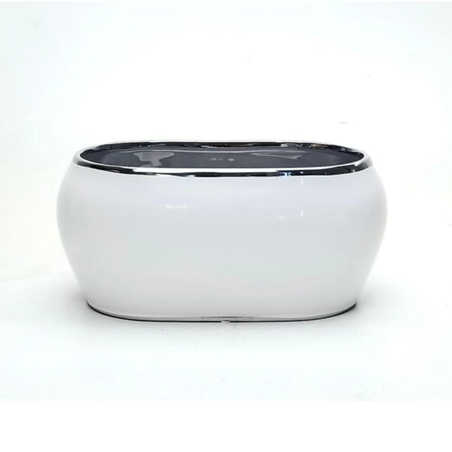 5”H X 9.5”L X 5”W LOW OVAL CERAMIC VASE WHITE WITH SILVER
