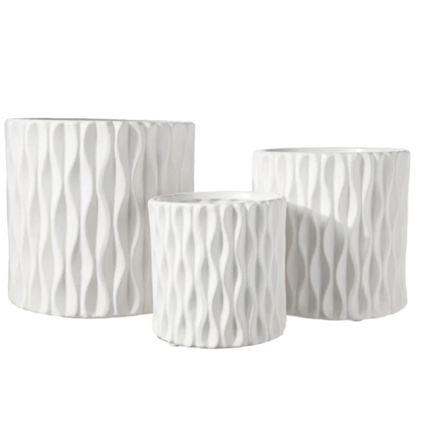 6.75”H X 7” LARGE WHITE CERAMIC CYLINDER WITH WAVE DESIGN PATTERN