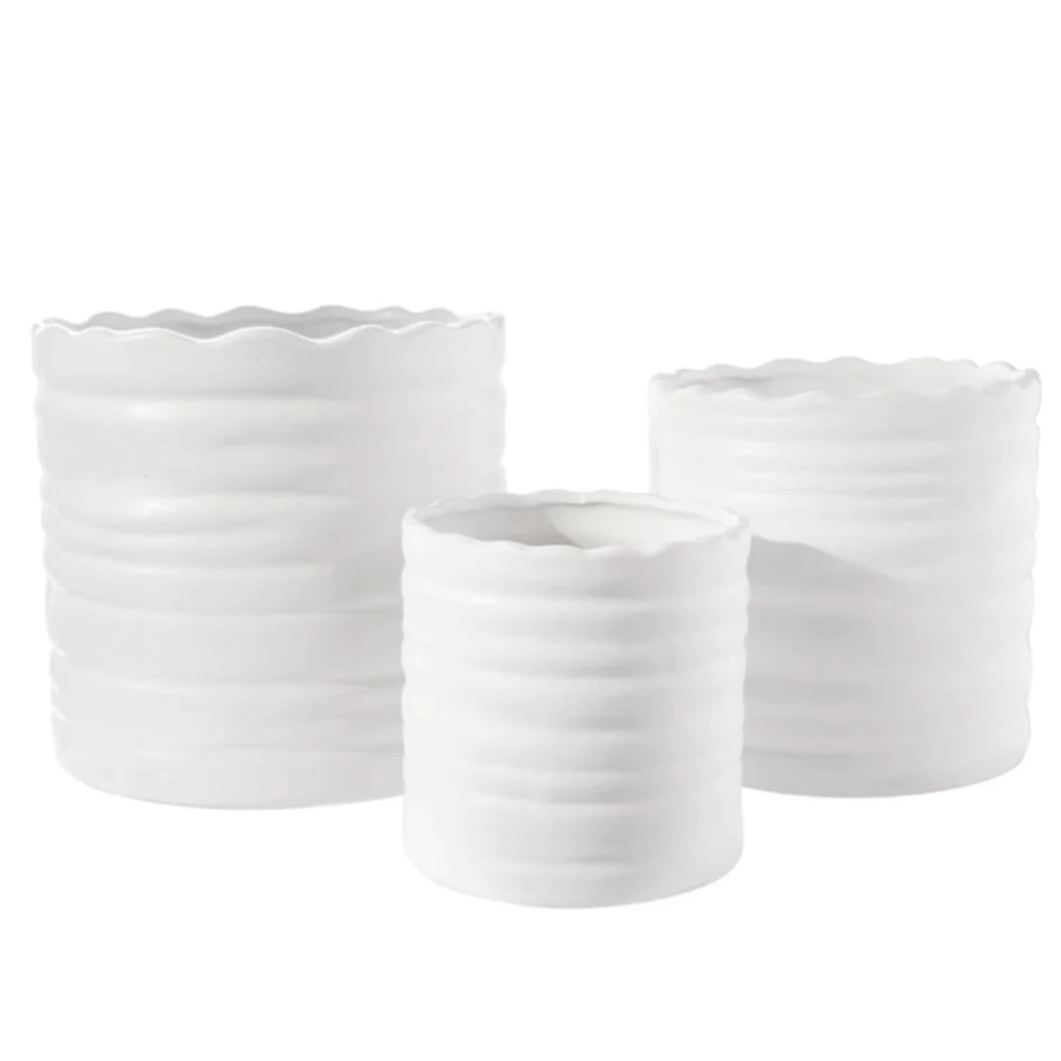 7.5”H X 8” LARGE WHITE CERAMIC CYLINDER IRREGULAR LIP AND EMBOSSED RIBBED LAYERED