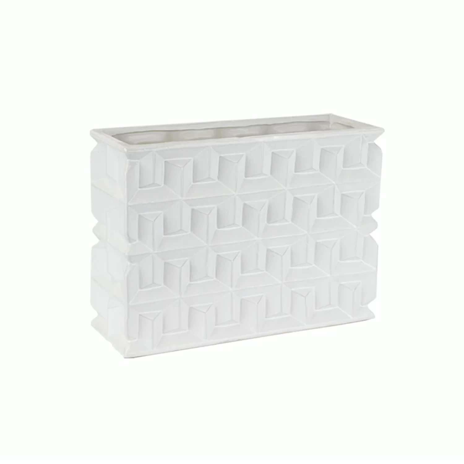 8.75”H X 11.75” X 4.75” WHITE EMBOSSED SQUARE CERAMIC VASE