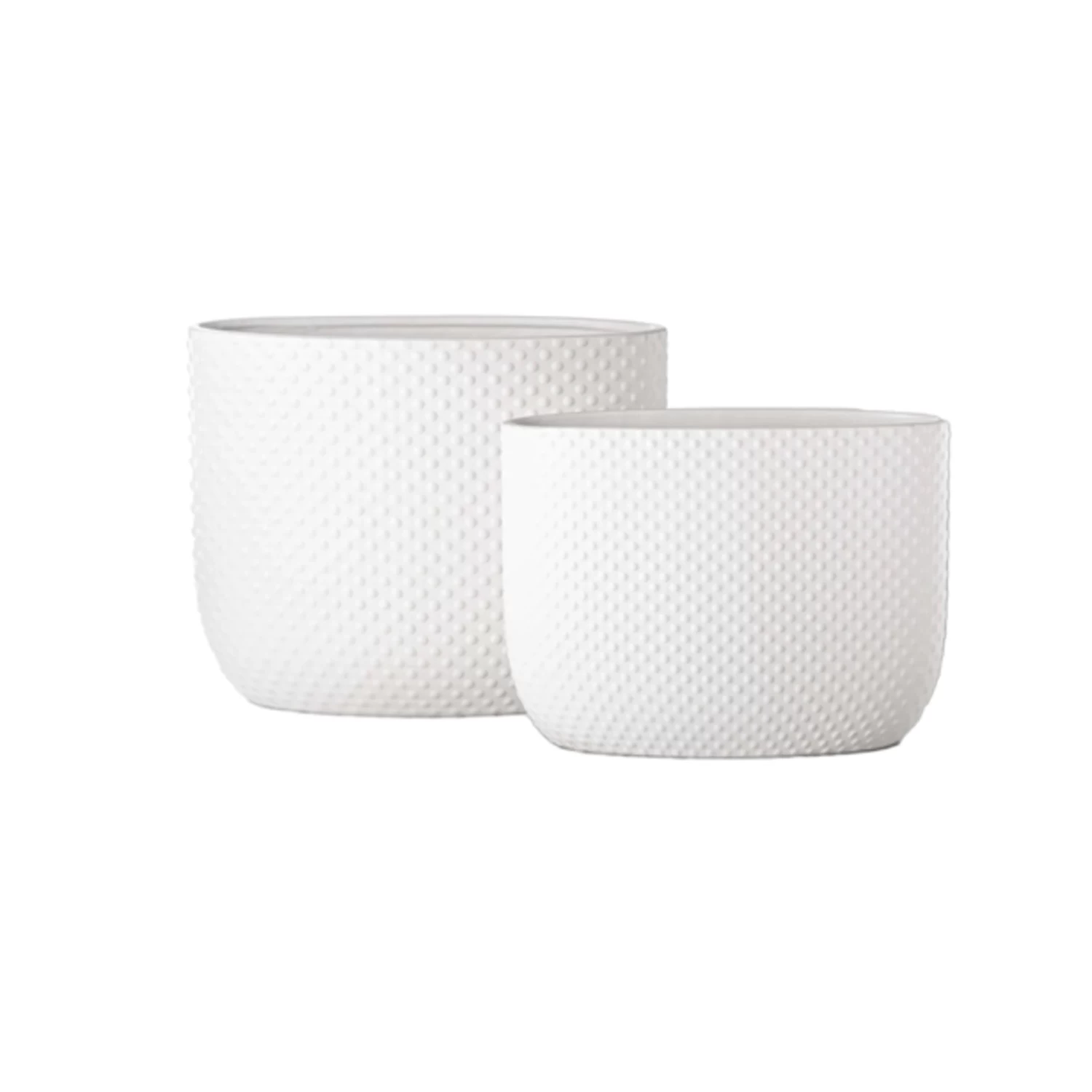 9.5”H X 12.5”L X 5”W SMALL MATTE WHITE CERAMIC TALL OVAL EMBOSSED DOTTED