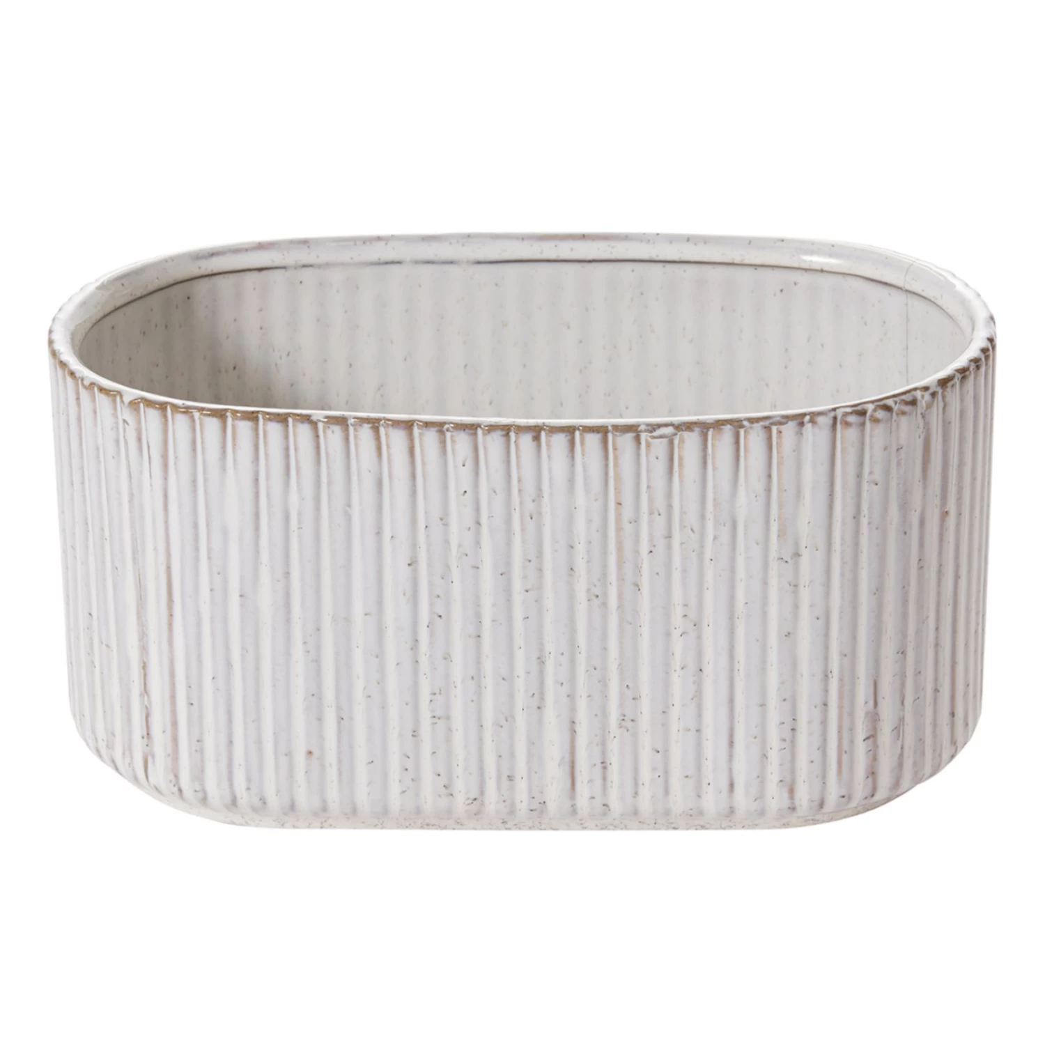 The Stable Planter comes in an oblong shape with a small footed pedestal bottom and ribbed glazed finish in the perfect shade of cream. A lined glossy pattern serves as the perfect backdrop for every plant.